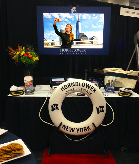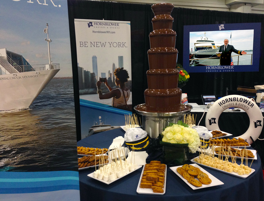 The Hornblower booth was fully branded with their logo, captain’s hats, rope, a giant chocolate fountain, and the glasses-free 3D display with their custom content.
