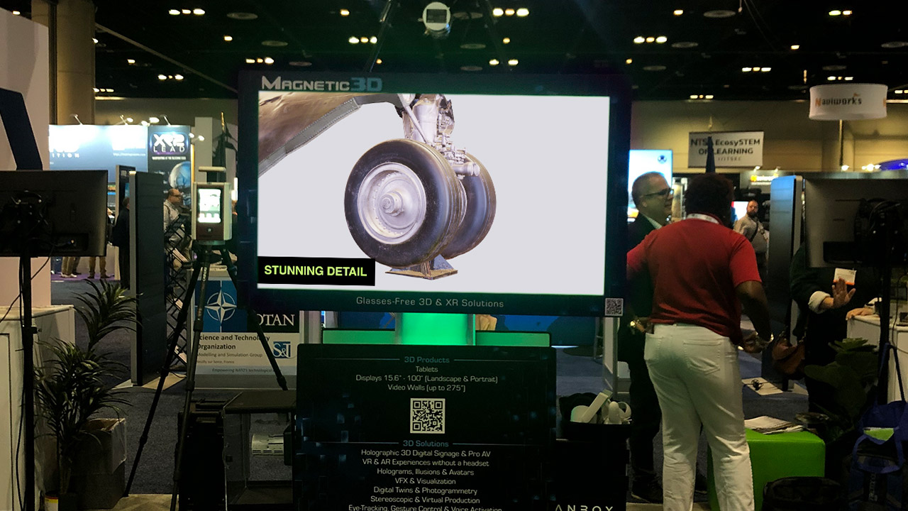 Magnetic 3D partnered with Allen & Company at I/ITSEC, the Interservice/Industry Training, Simulation and Education Conference, in Orlando Florida with dual “3D Lead Magnets” which included (2) 55” Wildfire DS Displays back-to-back on a center island 10×20 booth. The results were incredible with high impact Holographic 3D video content and a sizzle reel for Allen & Company shown on one side and a Digital Twin/ Interactive 3D experience demonstration on the other. Booth traffic was way up with more than 50 leads attributed to the 3D displays. Check out John Cunningham’s interview with our client and digital twin expert Marc Marion of Allen & Company on the show floor.