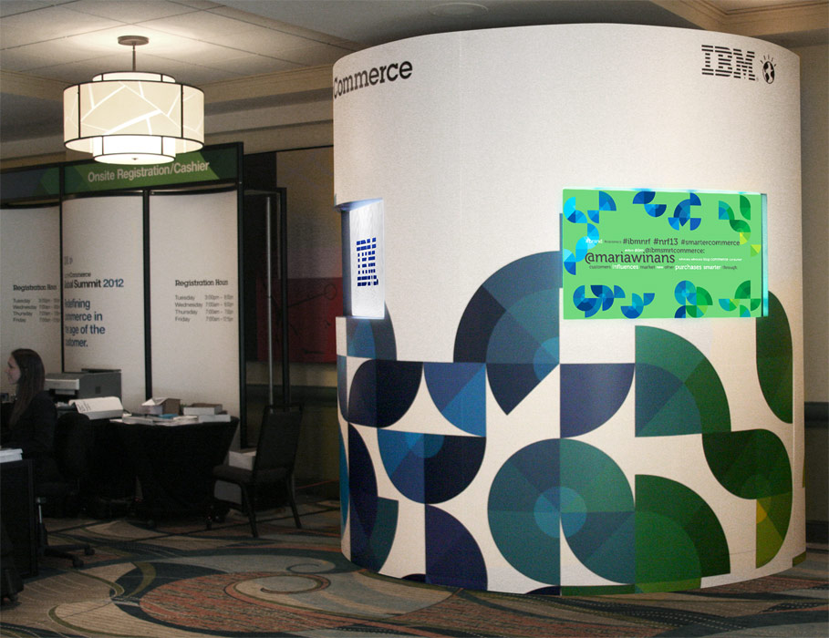 Magnetic 3D installed multiple displays for the IBM Smarter Commerce Global Summit 2012. There were displays around the administration area built into giant cylinders. Custom content was also made including 3D logo animations, 3D maps of the venue, and a real-time 3D twitter feed.