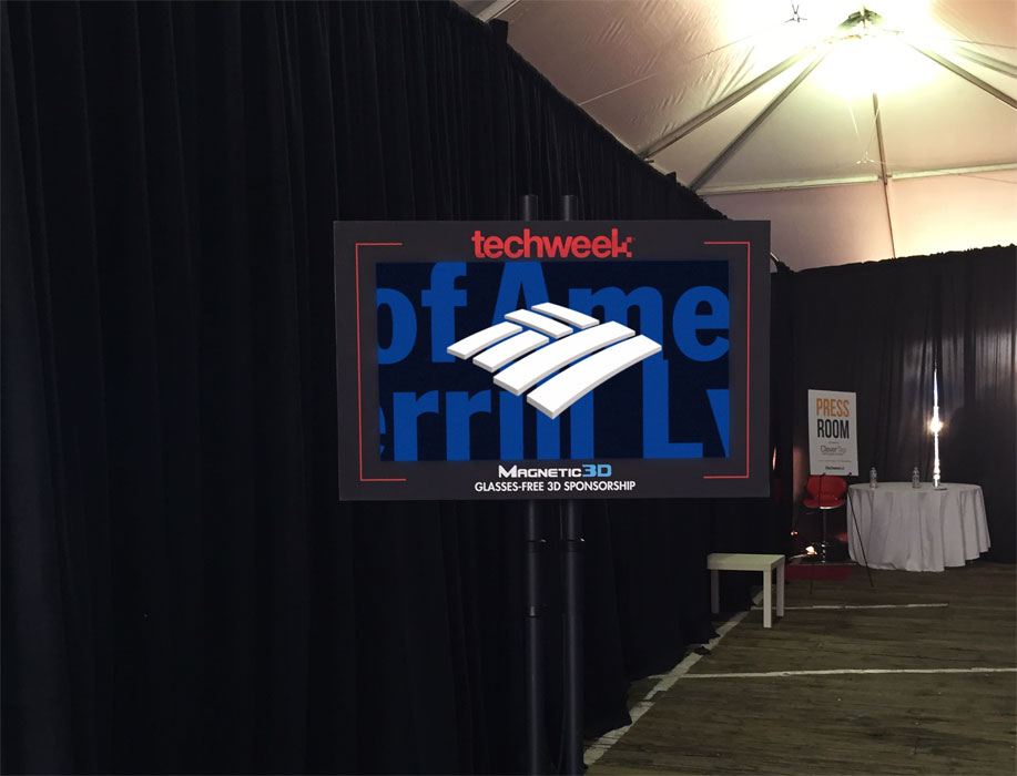 Magnetic 3D, the industry leader in autostereoscopic, “glasses-free 3D” solutions, partnered with Techweek to provide a captivating glasses-free 3D experience at Techweek Los Angeles 2015. Magnetic 3D provided a glasses-free 3D display for the event that was strategically located to welcome attendees with a unique and engaging experience. The innovative display is enabled to show high-definition 3D video content without the need for any special eyewear, providing audiences with a realistic 3D visual experience that includes both captivating off-screen “pop” and the immersive perception of depth on what would otherwise be a flat display.